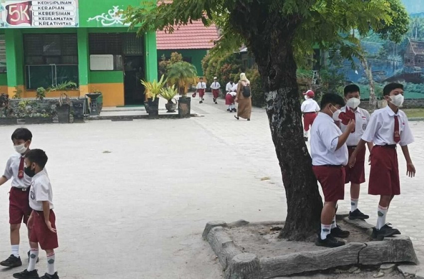 Sejumlah siswa di SDN11 Langkai Palangka Raya nampak menggunakan masker akibat kabut asap karhutla (foto: kontenkalteng.com)