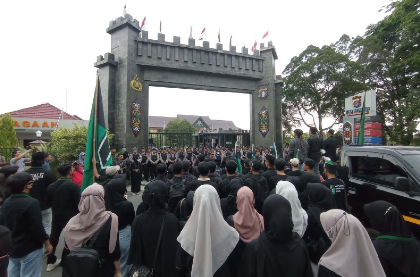 kontenkalteng.com, Palangka Raya- Ratusan mahasiswa yang tergabung dalam Himpunan Mahasiswa Islam (HMI) Cabang Palangka Raya, menggelar unjuk rasa di depan Mapolda Kalimantan Tengah (Kalteng), Selasa, 10 Oktober 2023.