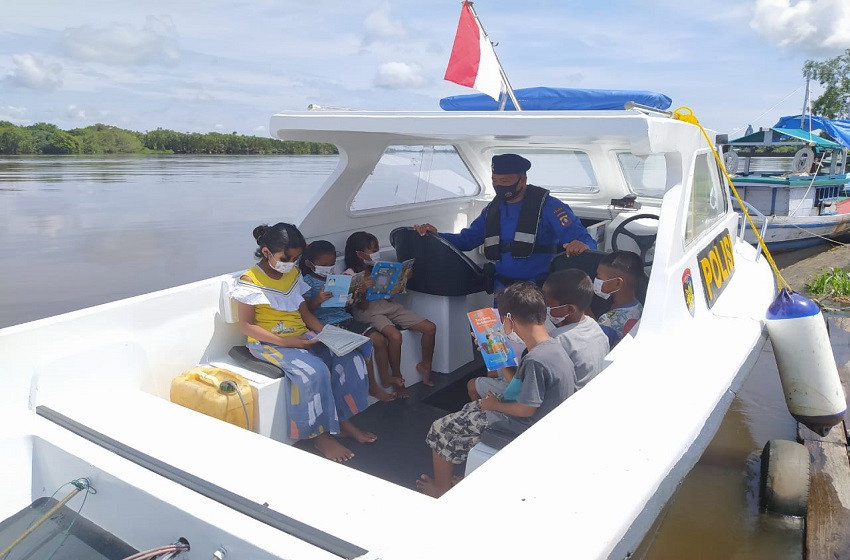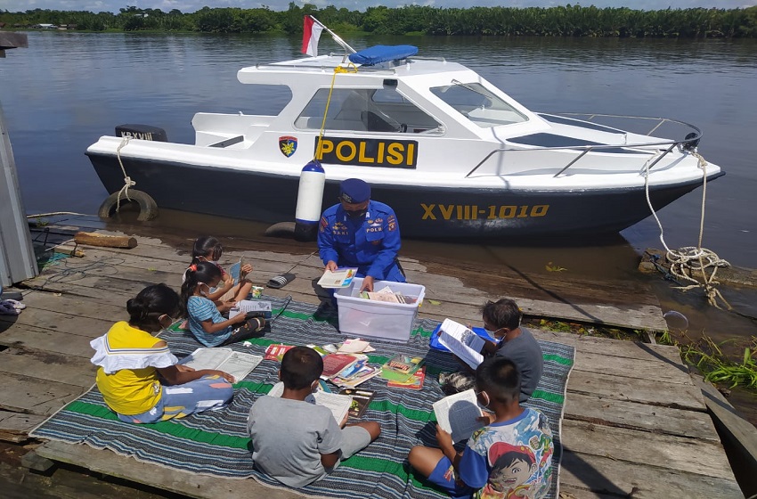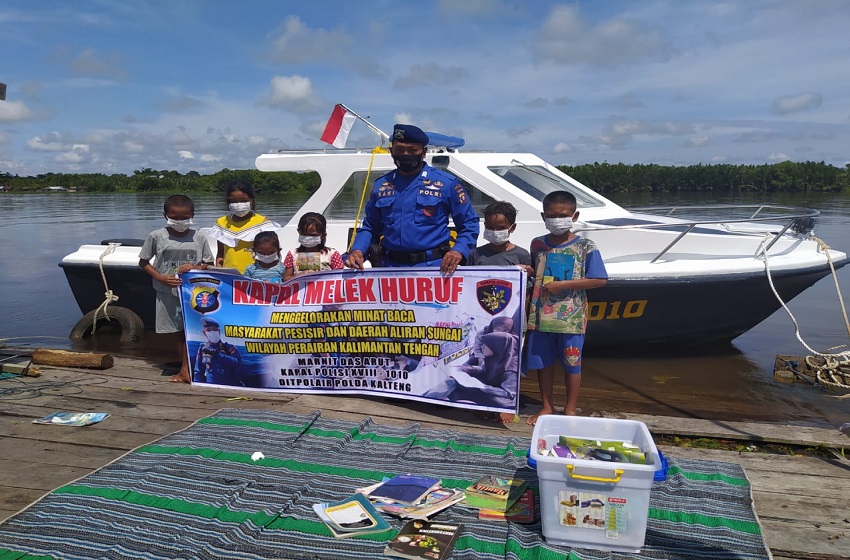 Ditpolairud Polda Kalteng melalui Kapal Melek Huruf, Kapal Polisi (KP) XVIII-1010 hadir membantu meningkatan mutu anak-anak pesisir Pantai, Desa Tanjung Putri Seberang, Kabupaten Kotawaringin Barat (Kobar) dengan membiasakan budaya membaca.