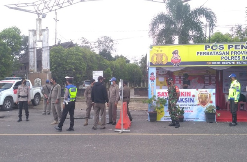 BARTIM - Satuan Pamong Praja (Satpol PP) Kabupaten Barito Timur, Kalimantan Tengah (Kalteng) Bersama tim terpadu melakukan penyekatan serta pemeriksaan terhadap semua kendaraan yang melintas di pintu masuk perbatasan Kalteng-Kalsel di Kabupaten barito Timur.