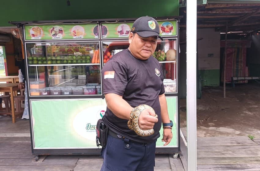 Kontenkalteng.com, Palangka Raya – Seekor ular piton dilaporkan masuk ke dalam warung milik warga di kawasan Jalan Diponegoro, tepatnya di depan Jalan Ranying Suring, Kota Palangka Raya, Senin (6/4/2026).