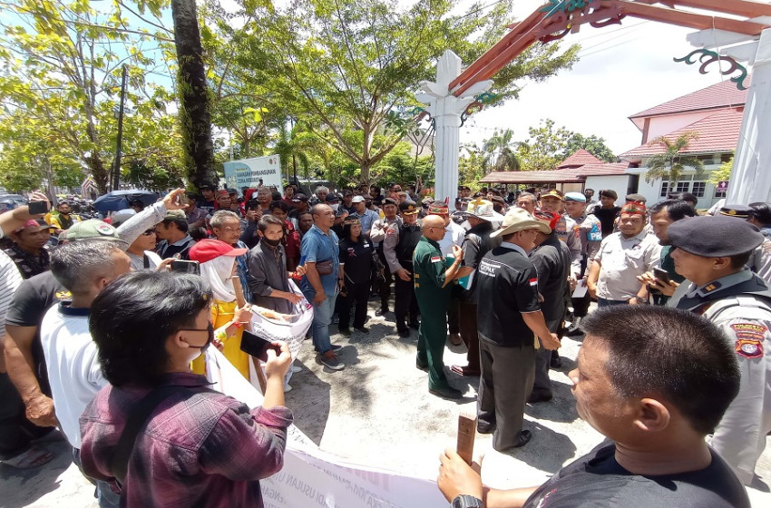 Palangka Raya-Ratusan masyarakat yang terdari dari berbagai organisasi masyarakat (Ormas) menggelar aksi di depan Kantor Agraria dan Tata Ruang, Badan Pertanahan Nasional (ATR/BPN) Palangka Raya, Rabu 29 Maret 2023.
