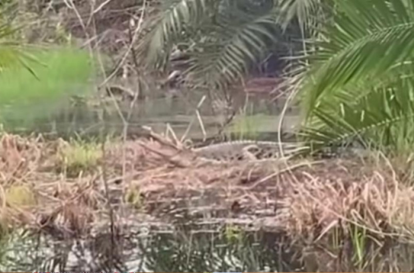 Video yang beredar memperlihatkan buaya berukuran cukup besar berada di pinggir sungai, di area yang dikelilingi semak dan perkebunan kelapa sawit.