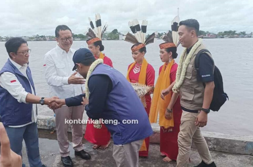 Kepala Perwakilan BI Kalteng Taufik Saleh ( kiri) dan Kepala BI Kalsel Wahyu Pratomo (kemeja panjang putih) saat menyalami tim yang tiba di pelabuhan Pasar Danau Mare, Kota Kuala Kapuas, Kabupaten Kapuas, Kalteng Rabu,10/5/2023 (foto:kontenkalteng)