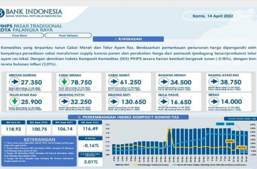 Mengutip catatan Pusat Informasi Harga Pangan Strategis (PIHPS) yang dirilis BI Kalteng, Kamis (14/4/2022) di dua pasar tradisional Palangka Raya yakni Pasar Besar dan Pasar Kahayan, sejumlah komuditas harga kebutuhan pokok warga cenderung mengalami penurunan harga walaupun ada beberapa yang barang tetap stabil.