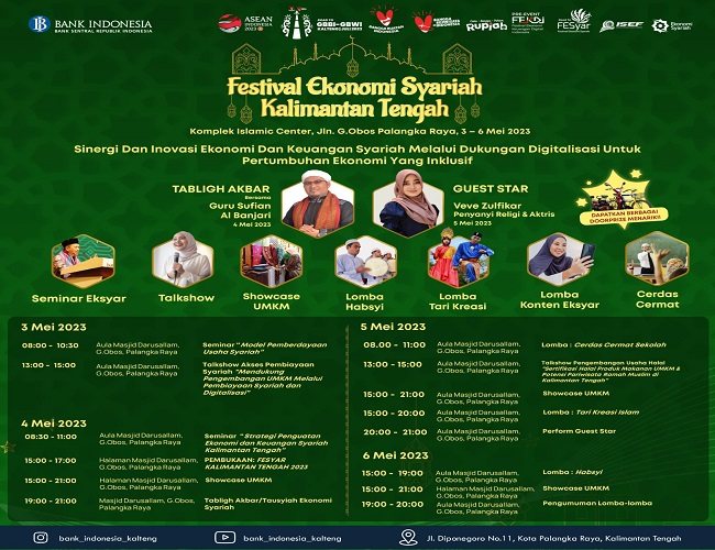 kontenkalteng.com,Palangka Raya-Kantor Perwakilan Bank Indonesia (BI) Kalteng akan menyelenggarakan Festival Ekonomi dan Keuangan Syariah(FESyar) Kalteng 2023 pada tanggal 3-6 Mei 2023 sebagai bukti komitmen Bank Indonesia untuk dorong kemajuan ekonomi syariah di Kalteng.