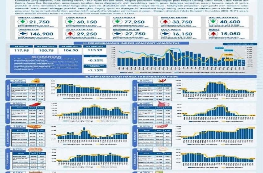 Untuk beberapa komuditas barang yang turun harganya dibanding hari sebelumnya (Selasa 2/10/2022) minyak goreng Rp 21.750, cabai rawit Rp 60.150, cabai merah rp 77.250 dan daging ayam ras Rp 40.160