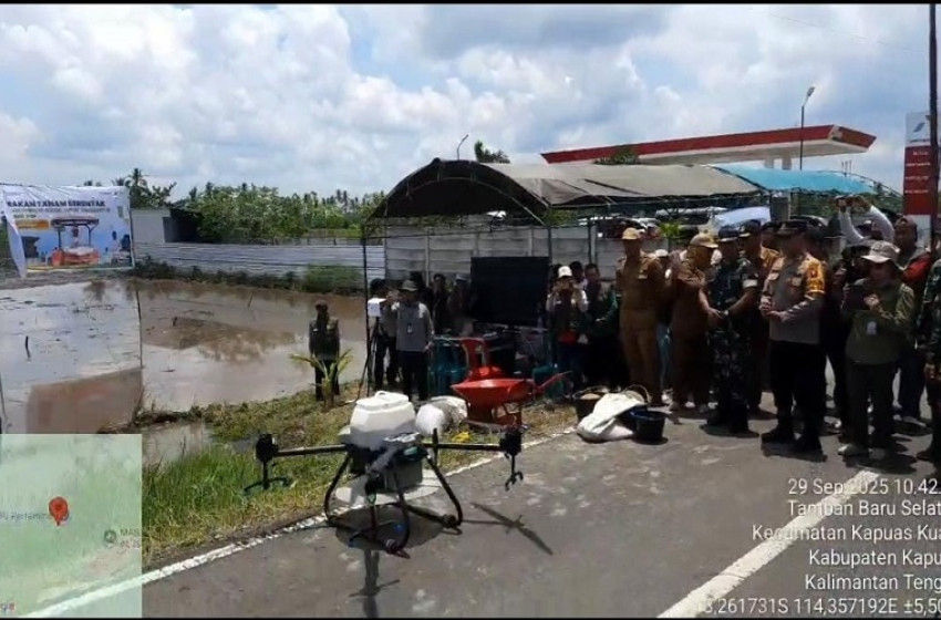 Brigade Pangan Kalteng menggunakan teknologi sebar benih drone di Desa Tamban Baru Selatan, Kec. Kahayan Kuala (Senin, 28/9/2025)