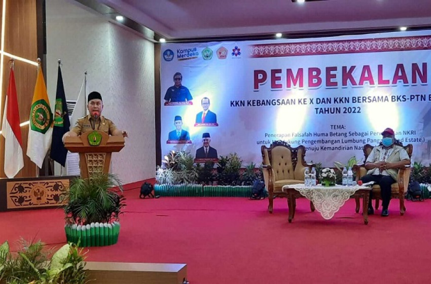Gubernur Kalteng H Sugianto Sabran memberikan pembekalan pada 1.000 mahasiswa dari 69 Universitas seluruh Indonesia yang merupakan Peserta KKN Kebangsaan ke X dan KKN Bersama BKS PTN Barat Tahun 2022 di Aula Universitas Palangka Raya (UPR), Senin (18/7/2022).
