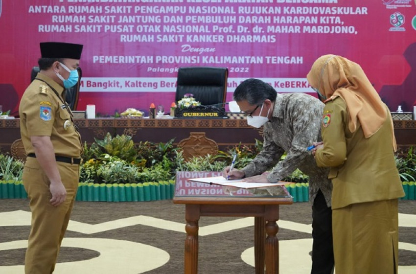 Gubernur Kalimantan Tengah (Kalteng) H. Sugianto Sabran menghadiri prosesi Penandatanganan Kesepakatan Bersama antara Rumah Sakit Pengampu Nasional Rujukan Kardiovaskular, Rumah Sakit Jantung dan Pembuluh Darah Harapan Kita, Rumah Sakit Pusat Otak Nasional Prof. Dr. dr. Mahar Mardjono dan Rumah Sakit Kanker Dharmais dengan Pemprov Kalteng. Penandatanganan berlangsung terpusat di Aula Jayang Tingang, Kantor Gubernur Kalteng, Senin (4/7/2022).