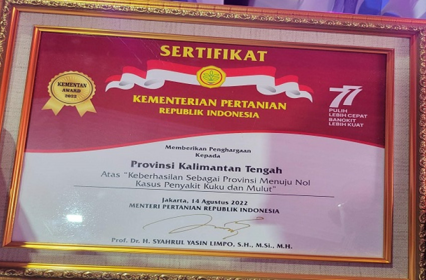 Kementerian Pertanian Republik Indonesia (RI) menganugerahi penghargaan kepada Provinsi Kalimantan Tengah (Kalteng) atas “Keberhasilan Sebagai Provinsi Menuju Nol Kasus Penyakit Mulut dan Kuku (PMK)”.