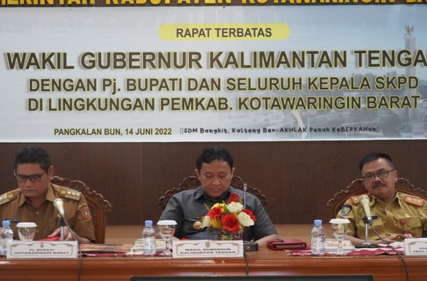 PANGKALAN BUN - Wakil Gubernur (Wagub) Kalimantan Tengah H. Edy Pratowo pimpin rapat terbatas atau ratas antara Pemerintah Provinsi Kalimantan Tengah (Pemprov Kalteng) dengan Pemerintah Daerah Kabupaten Kotawaringin Barat, bertempat di Aula Kantor Bupati Kotawaringin Barat, Selasa (14/6/2022).