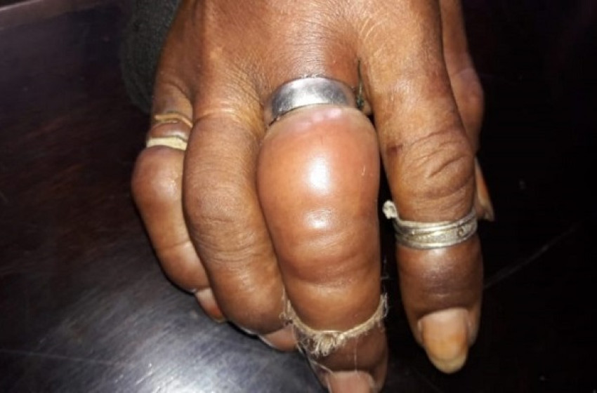 Tiga jari Toyiban yang bengkak akibat cincinnya kekecilan (foto: mmc palangka raya)